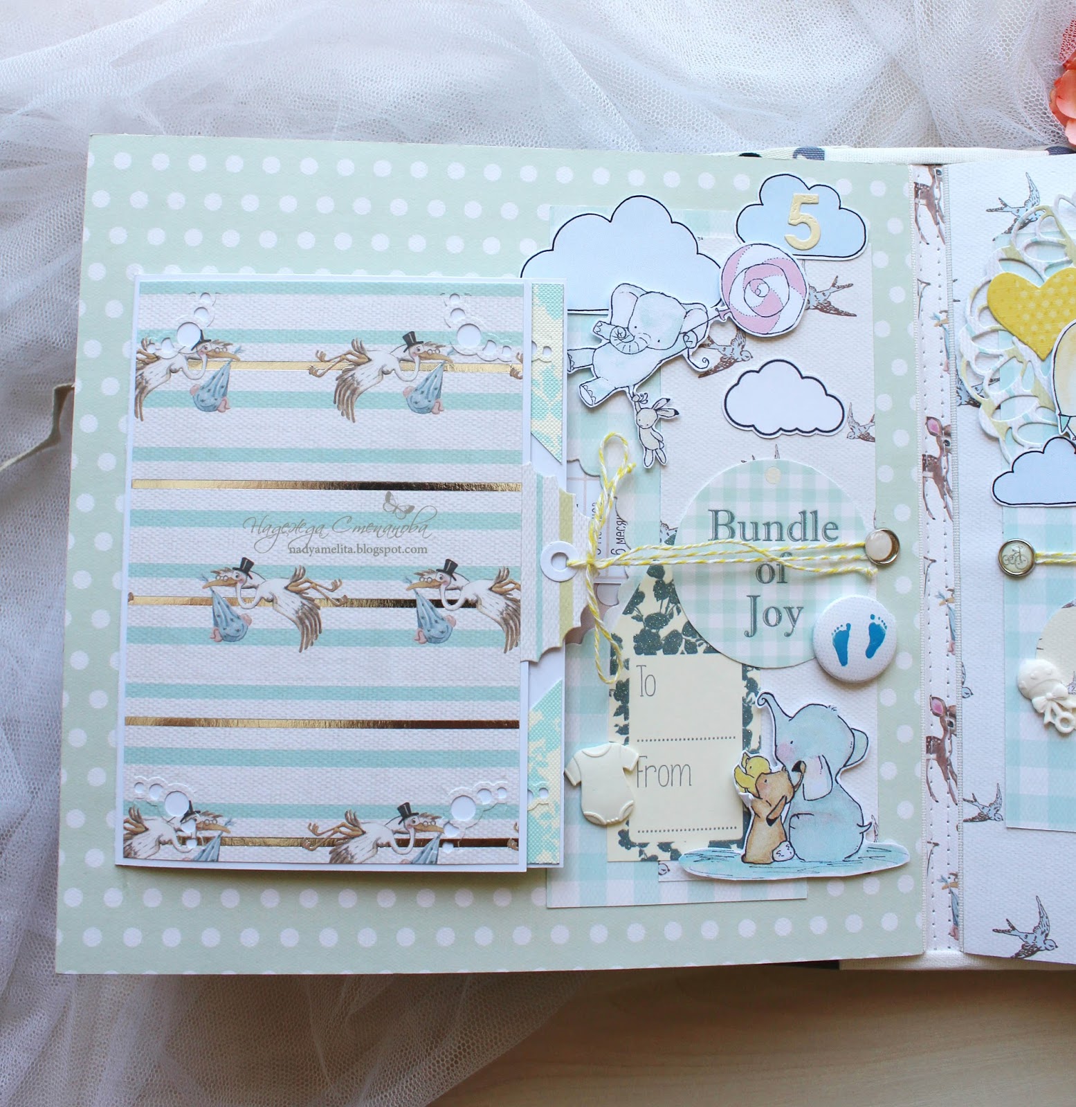 "Хочу представить вашему вниманию альбом для малыша. В альбоме использовала коллекцию "It's a boy" от First Edition и милых зверят, которые отыскала на просторах интернета. Альбом размером 23×24 см, на 6 разворотов, вмещает в себя 54 фотографии , размером 10×15 см + 2 места для фото узи, теги, конверты для бирочки из роддома и локона, карточки для заполнения роста, веса малыша и для зубиков. Еще есть два тежика, где можно сделать отпечатки ладошки и ножки малыша.